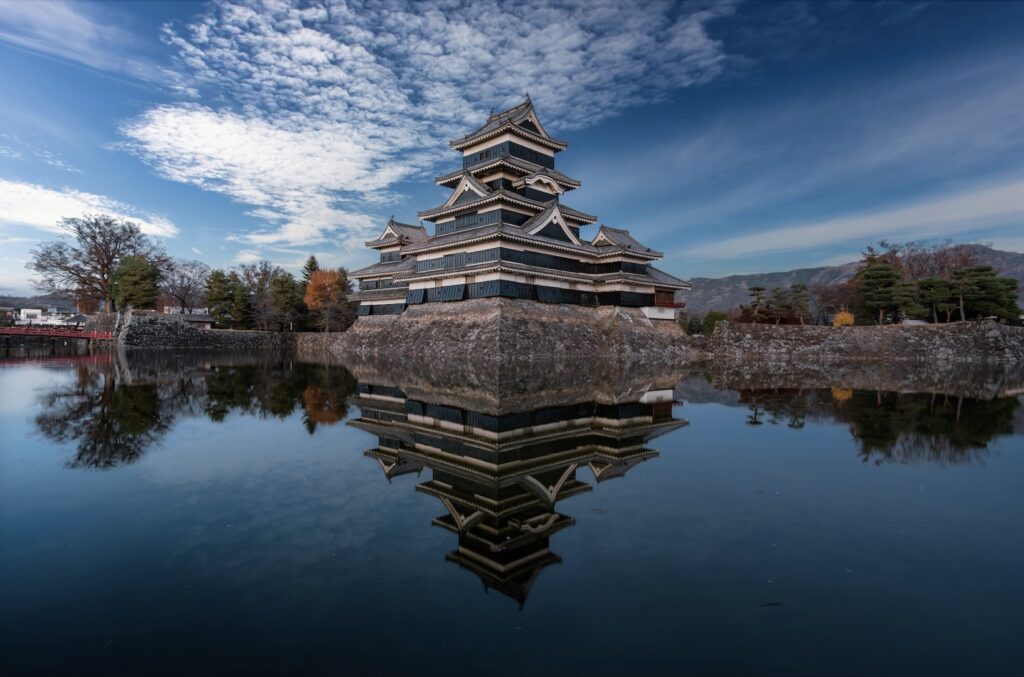 Matsumoto Castle (pictured, below), also known as the “Crow Castle” because of its striking black exterior, is one of the oldest surviving castles in Japan, dating back to the 16th century. Unlike many other castles, Matsumoto Castle has retained much of its original wooden structure. It stands out due to its unique combination of defensive design and aesthetic elegance. The castle in Nagano prefecture is surrounded by a moat, and its main keep offers visitors beautiful views of the Japanese Alps. Matsumoto Castle is particularly famous for its picturesque appearance, especially during the cherry blossom season.